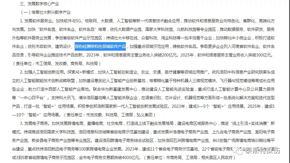 在《洛陽市數(shù)字化轉(zhuǎn)型行動計劃》中的第三項內(nèi)容發(fā)展數(shù)字核心產(chǎn)業(yè),其中的發(fā)展軟件服務(wù)業(yè)講到加快新一代信息技術(shù)融合應(yīng)用,推動軟件和信息服務(wù)業(yè)向特色化、集群化、高端化方向發(fā)展。加快“軟件名園、軟件名企、軟件名品”培育,依托專業(yè)園區(qū),推動數(shù)據(jù)服務(wù)、軟件研發(fā)、服務(wù)外包等軟件服務(wù)業(yè)發(fā)展,爭創(chuàng)省級軟件產(chǎn)業(yè)示范園區(qū);持續(xù)壯大本地骨干企業(yè),加快孵化中小微企業(yè),積極打造軟件名企;依托市政軟件、建筑設(shè)計、探傷檢測等特色領(lǐng)域軟件產(chǎn)品,加強重點領(lǐng)域示范應(yīng)用,鑄就軟件名品。爭取更多企業(yè)列入河南省軟件名企、軟件名品目錄,引導(dǎo)軟件企業(yè)推進(jìn)技術(shù)產(chǎn)品創(chuàng)新。