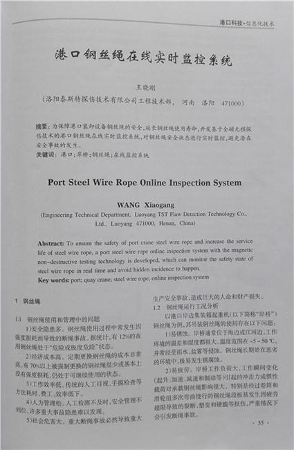 隨著公司新市場開拓不斷深入,市場反響逐漸升溫,尤其是面對港口行業(yè)對鋼絲繩安全問題關(guān)注度和解決方案渴求的急劇提升,針對港口行業(yè)的特殊工況環(huán)境和安規(guī)范要求,我公司和某港口達(dá)成戰(zhàn)略合作伙伴友好關(guān)系,為該港現(xiàn)場各類提升設(shè)備鋼絲繩提供安全監(jiān)測方案。豐富完備的港口現(xiàn)場數(shù)據(jù)和行業(yè)的鋼絲繩磁檢測技術(shù)結(jié)合成系列港口用鋼絲繩在線實(shí)時(shí)智能監(jiān)測系統(tǒng)。為了推而廣之向更多港口客戶提供TST產(chǎn)品保障安全的科技力量,同時(shí)也為了讓港口客戶對TST產(chǎn)品及技術(shù)方案在港口適用性有充分詳細(xì)的了解,TST 公司在港口行業(yè)權(quán)威性期刊《港口科技》2016年3月刊出《港口鋼絲繩在線實(shí)時(shí)監(jiān)控系統(tǒng)》論文。